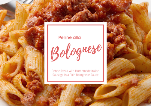 Penne pasta with homemade Italian sausage in a rich bolognese sauce.